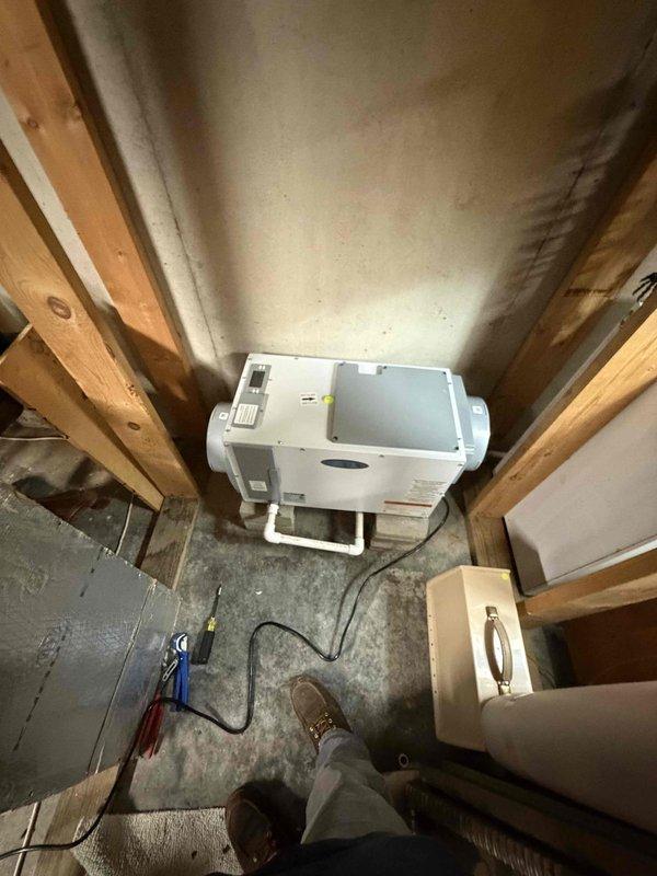 Successfully completed installation of LG dehumidifier unit in framed interior space, positioning the equipment on concrete flooring with proper electrical connections. All work was completed within the requested timeframe, with system fully operational and ready for customer use.